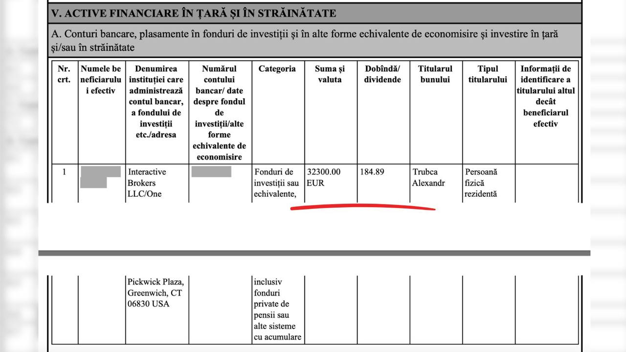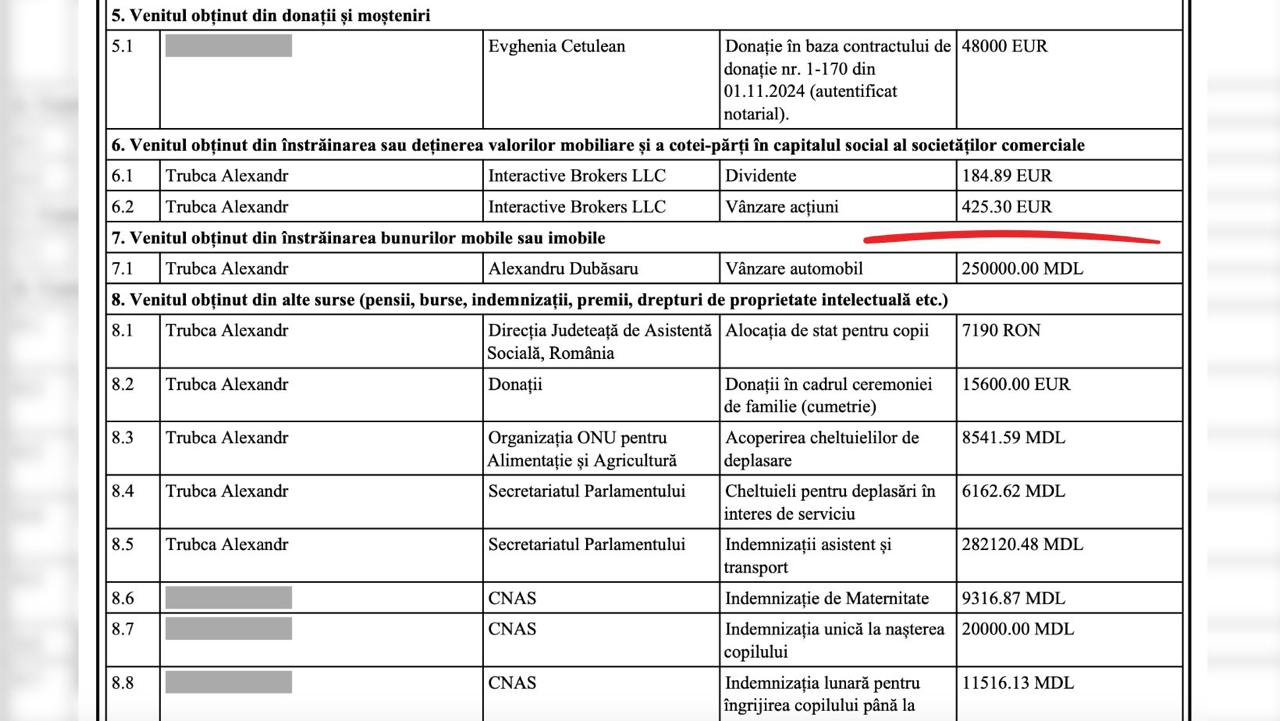 Președintele Comisiei parlamentare pentru agricultură și industrie alimentară nu a indicat ce acțiuni deține, însă dividendele și vânzările i-au adus lui Trubca un venit de peste 600 de euro.