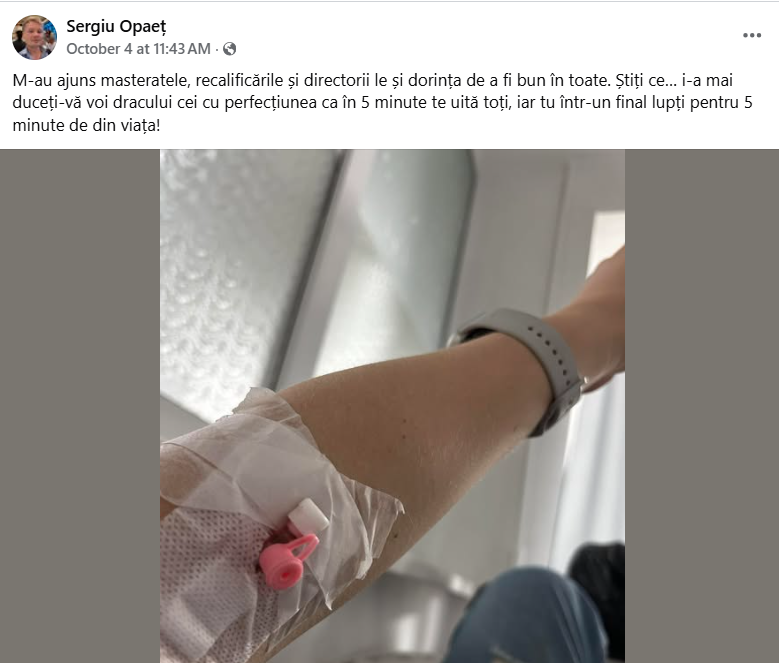 „M-au ajuns masteratele, recalificările și directoriile și dorința de a fi bun în toate. Știți ce… ia mai duceți-vă voi dracului, cei cu perfecțiunea, că în 5 minute te uită toți, iar tu într-un final lupți pentru 5 minute din viață!”, a scris Sergiu Opaeț, pe rețele, la începutul lunii octombrie.