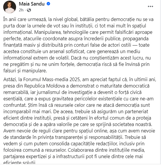 Astăzi, la Forumul Mass-media 2025, am apreciat faptul că, în ultimii ani, presa din Republica Moldova a demonstrat o maturitate democratică remarcabilă, iar jurnalismul de investigație a devenit o forță civică esențială, care a expus gravitatea pericolelor existențiale cu care ne-am confruntat. Știm însă că resursele celor care ne atacă democrația sunt incomparabil mai mari. De aceea, trebuie să asigurăm un parteneriat eficient dintre instituții, presă și cetățeni în efortul comun de a proteja democrația și de a apăra valorile pe care se sprijină societatea noastră. Avem nevoie de reguli clare pentru spațiul online, așa cum avem nevoie de standarde în privința transparenței și responsabilității. Trebuie să vedem și cum putem consolida capacitățile redacțiilor, inclusiv prin folosirea comună a resurselor. Colaborarea dintre instituțiile media, partajarea expertizei și a infrastructurii pot fi unele dintre cele mai eficiente soluții”, a declarat Maia Sandu la Forumul mass-media 2025.