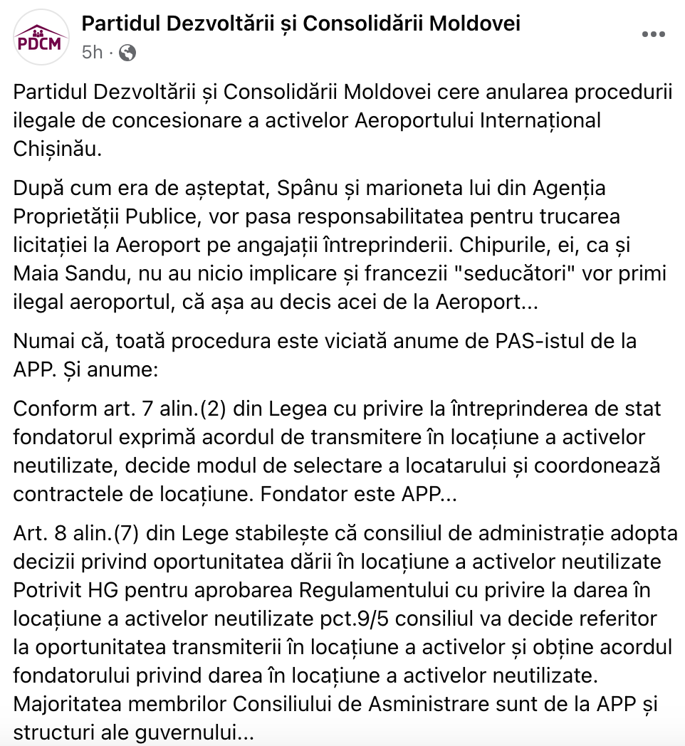 În aceste condiții, Partidul Dezvoltării și Consolidării Moldovei cere APP să anuleze procedura de concesionare a activelor Aeroportului Internațional Chișinău. Juriștii PDCM vor depune o Sesizare la Procuratură pe faptul fraudării licitației de concesionare, având drept temei încălcările specificate mai sus”, se arată în comunicatul Partidului Dezvoltării și Consolidării Moldovei.