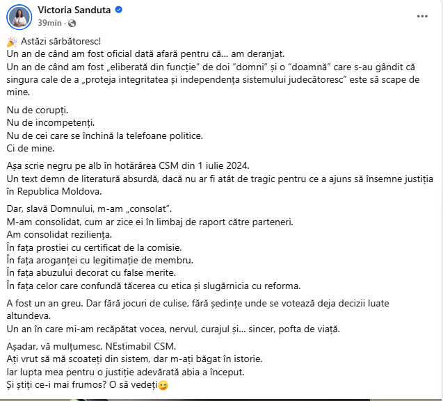 Așadar, vă mulțumesc, NEstimabil CSM. Ați vrut să mă scoateți din sistem, dar m-ați băgat în istorie. Iar lupta mea pentru o justiție adevărată abia a început. Și știți ce-i mai frumos? O să vedeți”, a scris Victoria Sanduța.
