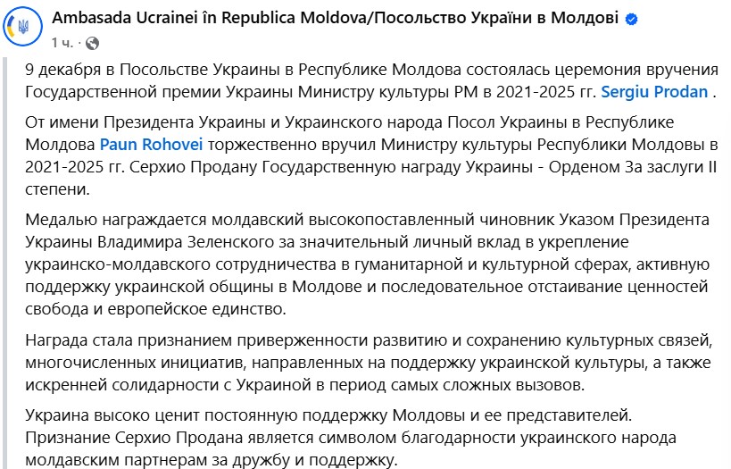 Ucraina apreciază înalt sprijinul constant al Republicii Moldova și al reprezentanților săi. Recunoașterea acordată lui Sergiu Prodan este un simbol al recunoștinței poporului ucrainean față de partenerii moldoveni pentru prietenie și susținere”, notează responsabilii.