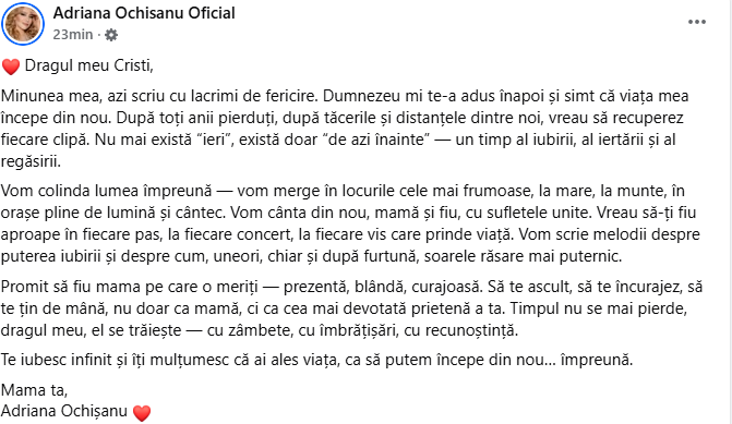 „Minunea mea, azi scriu cu lacrimi de fericire. Dumnezeu mi te-a adus înapoi și simt că viața mea începe din nou. După toți anii pierduți, după tăcerile și distanțele dintre noi, vreau să recuperez fiecare clipă. Nu mai există “ieri”, există doar “de azi înainte” — un timp al iubirii, al iertării și al regăsirii.