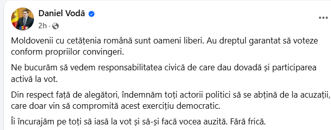 „Moldovenii cu cetățenia română sunt oameni liberi. Au dreptul garantat să voteze conform propriilor convingeri. Ne bucurăm să vedem responsabilitatea civică de care dau dovadă și participarea activă la vot. Din respect față de alegători, îndemnăm toți actorii politici să se abțină de la acuzații, care doar vin să compromită acest exercițiu democratic. Îi încurajăm pe toți să iasă la vot și să-și facă vocea auzită. Fără frică”, a scris purtătorul de cuvânt al Executivului RM, Daniel Vodă.