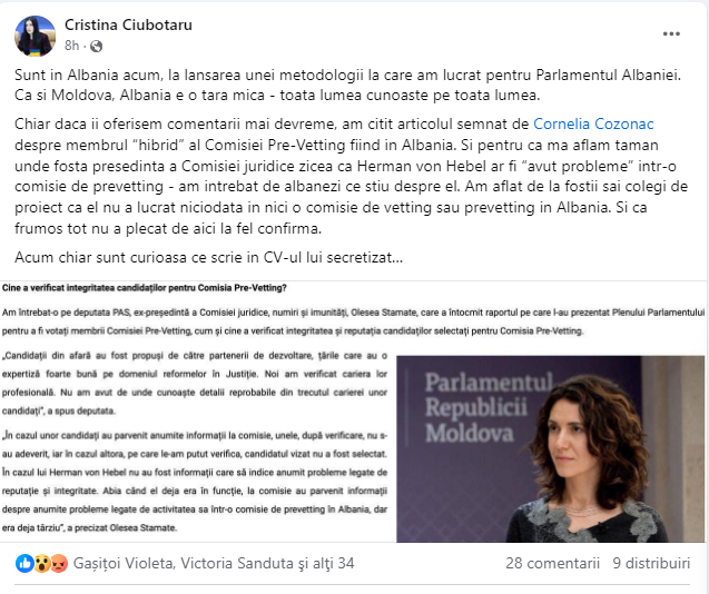 Întrebată cum și cine a verificat integritatea și reputația persoanelor selectate în componența Pre-Vetting, în contextul dezvăluirilor ce-l vizează pe președintele Comisiei, Herman von Hebel, Olesea Stamate, ex-președinta Comisiei juridice numiri și imunități, a răspuns: „Nu au fost informații care să indice anumit probleme legate de reputație și integritate. Abia când el deja era în funcție, la comisie au parvenit informații despre anumite probleme legate de activitatea sa într-o comisie de prevetting în Albania, dar era deja târziu”.