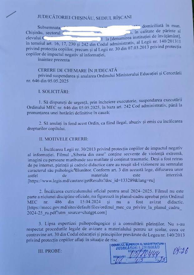 În cerere se solicită Judecătoriei Chișinău, sediul Rîșcani, să suspende și anuleze ordinul MEC și se enumeră motivele.