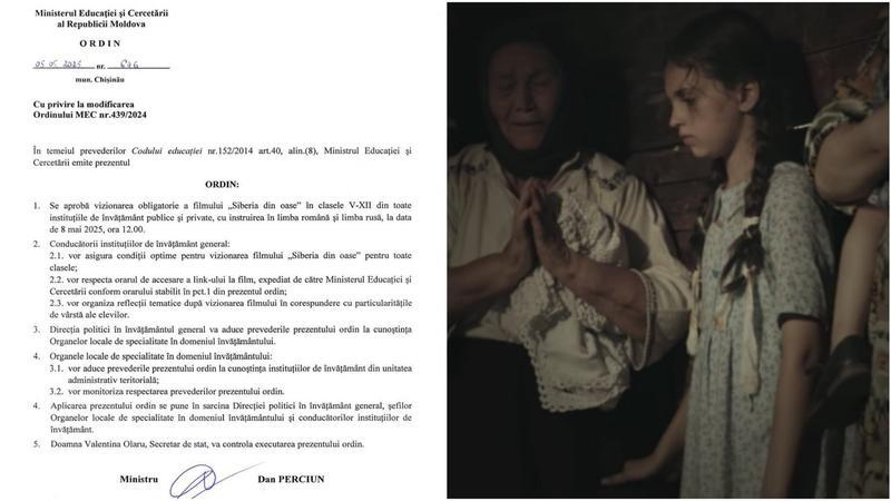 Ministerul Educației și Cercetării a emis un ordin, potrivit căruia elevii claselor V-XII din toate instituţiile de învăţământ publice și private din țară sunt obligați să privească, pe 8 mai, în locul orelor de după ora 12:00, filmul „Siberia din oase”.