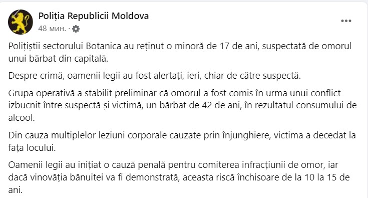 Oamenii legii au inițiat o cauză penală pentru comiterea infracțiunii de omor, iar dacă vinovăția bănuitei va fi demonstrată, aceasta riscă închisoare de la 10 la 15 de ani”, comunică IGP.