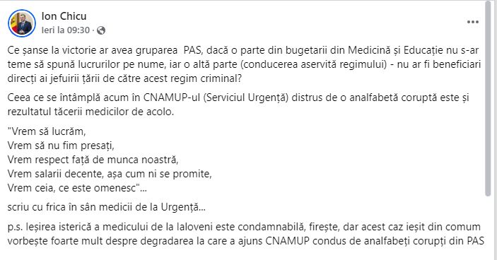 Apropo, ieșirea isterică a medicului de la Ialoveni este condamnabilă, firește, dar acest caz ieșit din comun vorbește foarte mult despre degradarea la care a ajuns CNAMUP condus de analfabeți corupți din PAS”, a scris Ion Chicu.