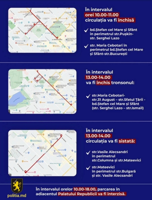 În intervalul orelor 13:00-14:00, traficul rutier în perimetrul străzilor Maria Cebotari-31 August – Sfatul Țării - bd.Ștefan cel Mare și Sfânt și bd. Ștefan cel Mare și Sfânt -perimetru străzilor Serghei Lazo –Ismail va fi închis.