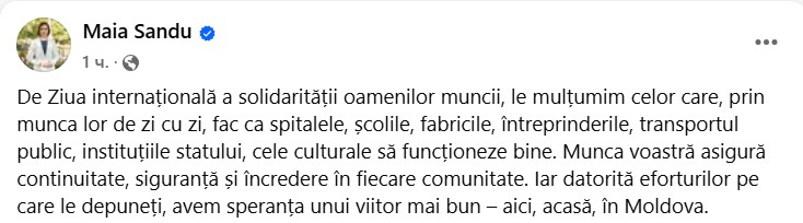 „De Ziua internațională a solidarității oamenilor muncii, le mulțumim celor care, prin munca lor de zi cu zi, fac ca spitalele, școlile, fabricile, întreprinderile, transportul public, instituțiile statului, cele culturale să funcționeze bine. Munca voastră asigură continuitate, siguranță și încredere în fiecare comunitate. Iar datorită eforturilor pe care le depuneți, avem speranța unui viitor mai bun – aici, acasă, în Moldova”, a scris șefa statului.