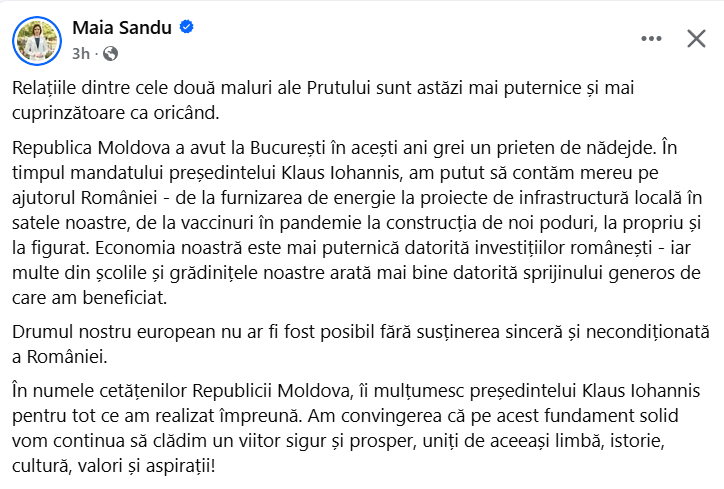 Republica Moldova a avut la București în acești ani grei un prieten de nădejde. În timpul mandatului președintelui Klaus Iohannis, am putut să contăm mereu pe ajutorul României - de la furnizarea de energie la proiecte de infrastructură locală în satele noastre, de la vaccinuri în pandemie la construcția de noi poduri, la propriu și la figurat. Economia noastră este mai puternică datorită investițiilor românești - iar multe din școlile și grădinițele noastre arată mai bine datorită sprijinului generos de care am beneficiat.