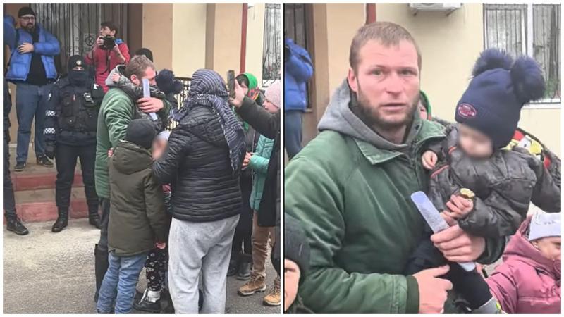 Momente emoționante în fața clădirii Judecătoriei Strășeni. Bărbatul, eliberat după ce fusese reținut, pe 10 februarie, a ieșit și și-a cuprins soția și copiii.