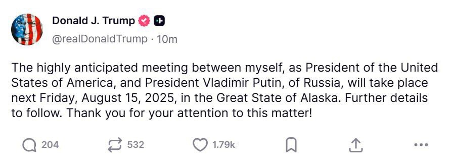Trump a anunţat întâlnirea din 15 august pe reţelele de socializare, iar ulterior aceasta a fost confirmată de un purtător de cuvânt al Kremlinului, care a declarat că locaţia este „destul de logică”, având în vedere proximitatea relativă a Alaskăi faţă de Rusia.