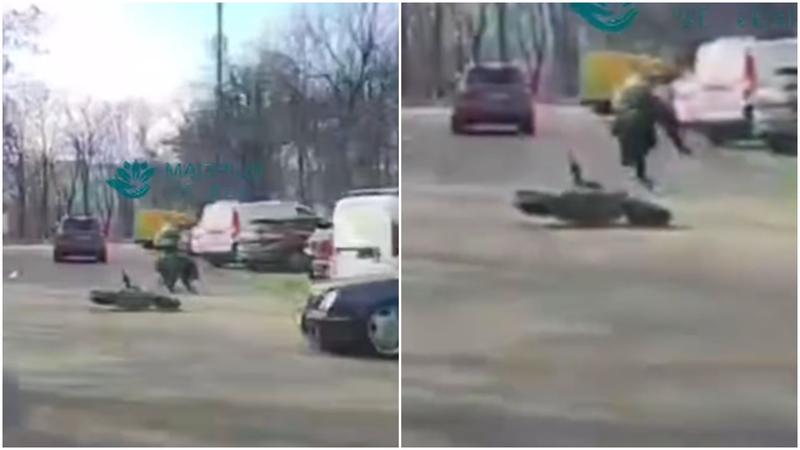 În urma impactului, tânărul cu trotineta electrice a zburat peste capota mașinii, aterizând pe asfalt. Acesta s-a rostogolit, apoi imediat s-a ridicat în picioare.