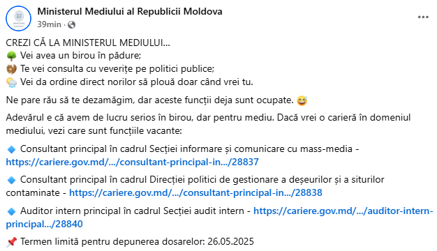 Adevărul e că avem de lucru serios în birou, dar pentru mediu. Dacă vrei o carieră în domeniul mediului, vezi care sunt funcțiile vacante: