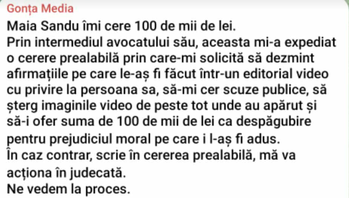 Prin intermediul avocatului său, aceasta mi-a expediat o cerere prealabilă prin care-mi solicită să dezmint afirmațiile pe care le-aș fi făcut într-un editorial video cu privire la persoana sa, să-mi cer scuze publice, să șterg imaginile video de peste tot unde au apărut și să-i ofer suma de 100 de mii de lei ca despăgubire pentru prejudiciul moral pe care i l-aș fi adus.