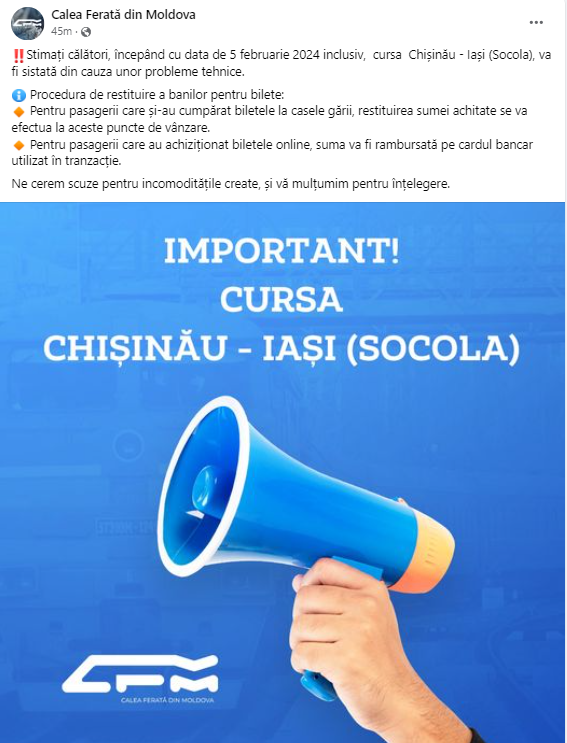 „Stimați călători, începând cu data de 5 februarie 2024 inclusiv, cursa Chișinău - Iași (Socola), va fi sistată din cauza unor probleme tehnice.