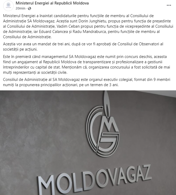 Este vorba despre 4 din 9 funcții de membru al Consiliului de Administrație de la MoldovaGaz, desemnați de Ministerul Energiei, pe care instituția statului a anunțat că le va scoate la concurs.
