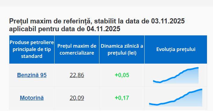 Agenția Națională pentru Reglementare în Energetică anunță prețuri și mai mari la carburanți pentru mâine, 4 noiembrie. Șoferii vor trebui să achite pentru litrul de motorină cu 17 bani mai mult, iar pentru cel de benzină cu 5 de bani mai mult decât astăzi.
