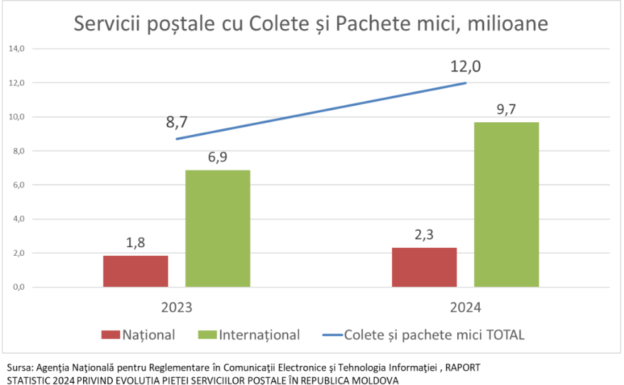 - Numărul de colete și pachete mici expediate a fost de 12 milioane în 2024, dintre care: 9,7 milioane internaționale (în creștere cu +40%) 2,3 milioane naționale (creștere ușoară).