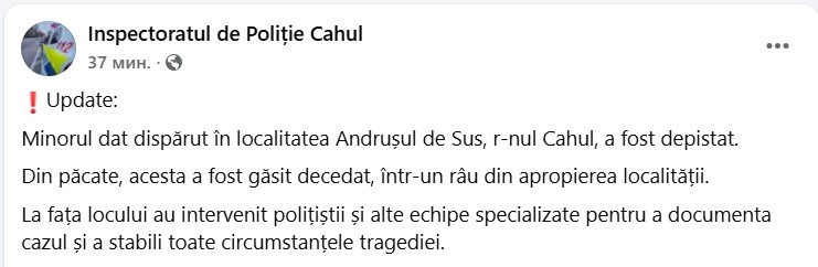 Un final trist în cazul băiatului dat dispărut în localitatea Andrușul de Sus, raionul Cahul. Acesta a fost găsit decedat într-un râu din apropierea localității.