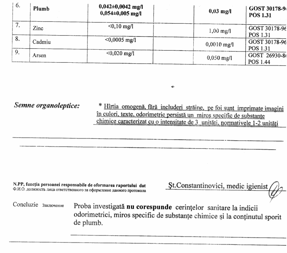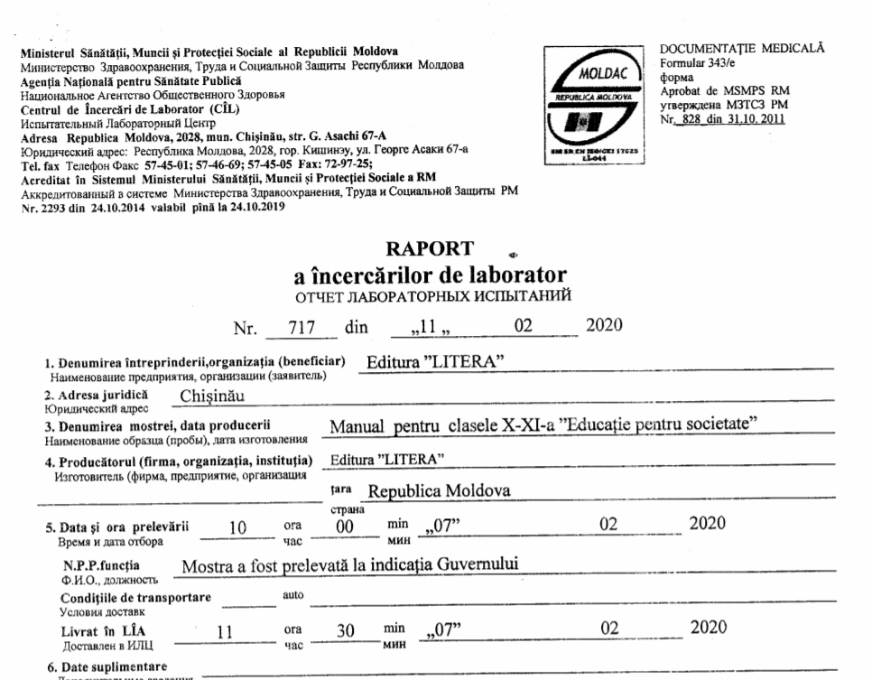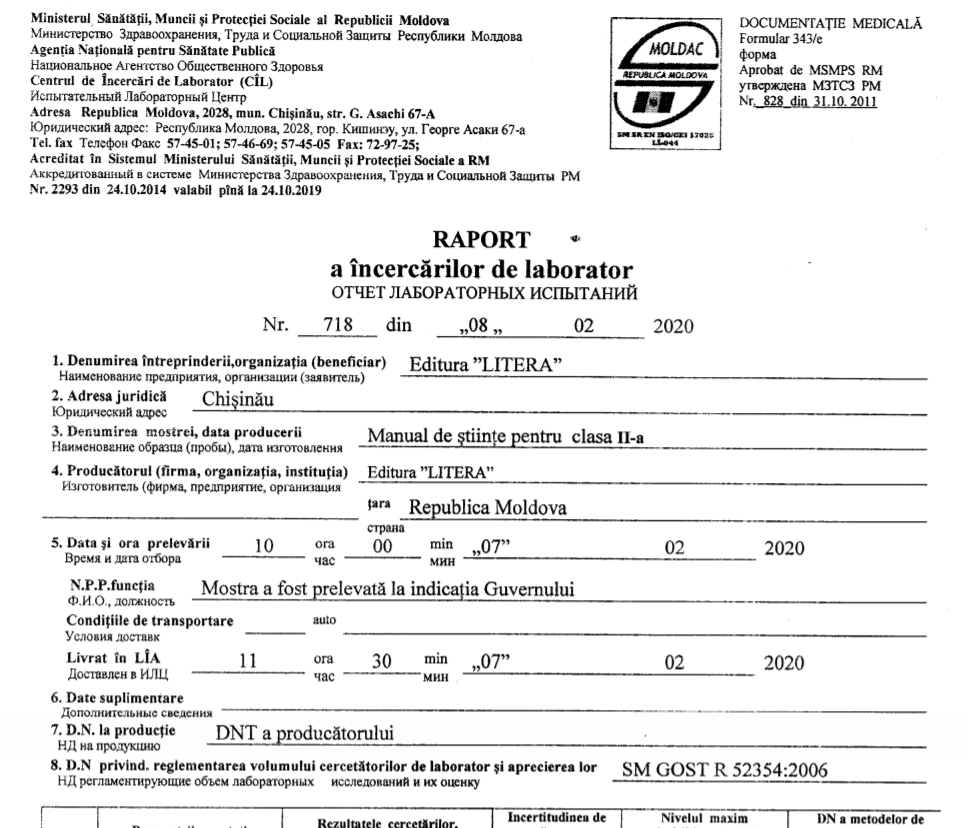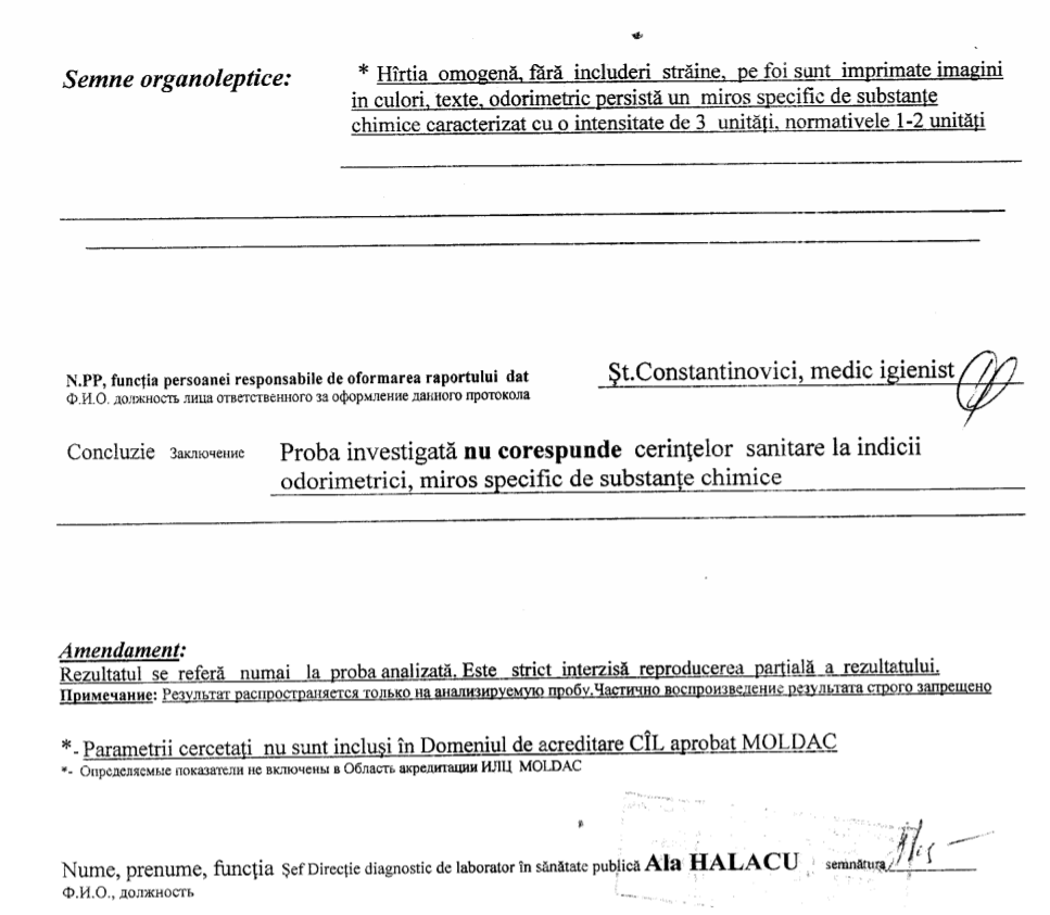 Agenția Națională pentru Sănătate Publică a efectuat expertiza sanitară a manualelor școlare pentru disciplina „Științe”, clasa a II-a și „Educație pentru societate”, clasele X-XI. Rezultatele arată că, în cazul manualului pentru disciplina „Știiințe”, clasa a II-a, persistă un miros specific de substanțe chimice, iar „Educație pentru societate”, clasele X-XI, conține un nivel sporit de plumb, și anume 0,042 mg/l, pe când cantitatea admisibilă este de doar 0,03 mg/l.