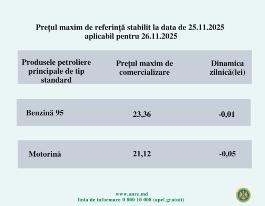 Agenția Națională pentru Reglementare în Energetică (ANRE) a publicat noile prețuri maxime de referință pentru produsele petroliere, valabile pentru mâine 26 noiembrie 2025.