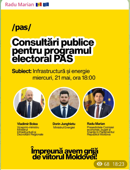„Amintesc că la PAS am început consultările publice pentru elaborarea programului electoral pentru alegerile parlamentare din 28 septembrie. La aceste evenimente, participanții vor putea propune politici și acțiuni pe care ar trebui să le implementeze PAS în următorii 4 ani.