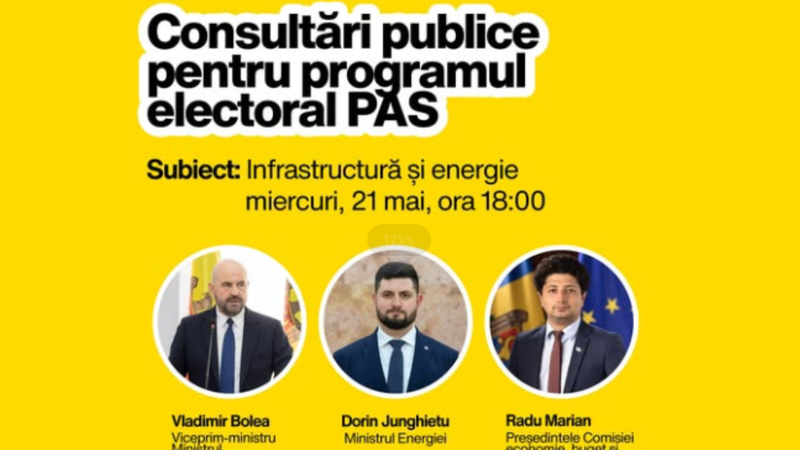 Prima consultare va fi organizată miercuri, 21 mai 2025, începând cu ora 18.00, în Chișinău, pe adresa indicată în formular, pe subiectele INFRASTRUCTURĂ și ENERGIE. La consultări vor fi prezenți deputați/miniștri/secretari de stat. Pentru cei care nu pot să participe, dar vor să lase o propunere, vă rugăm să folosiți formularul indicat.